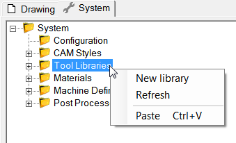 Libraries of tools can be maintained in the system tab’s Tools folder.